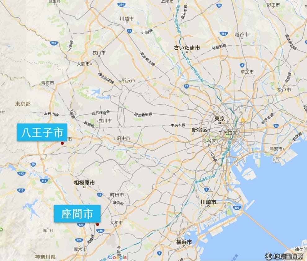 圖為八王子市(失蹤女子住處)與座間市(嫌犯住處)的位置圖,兩地相距約 20多公里。