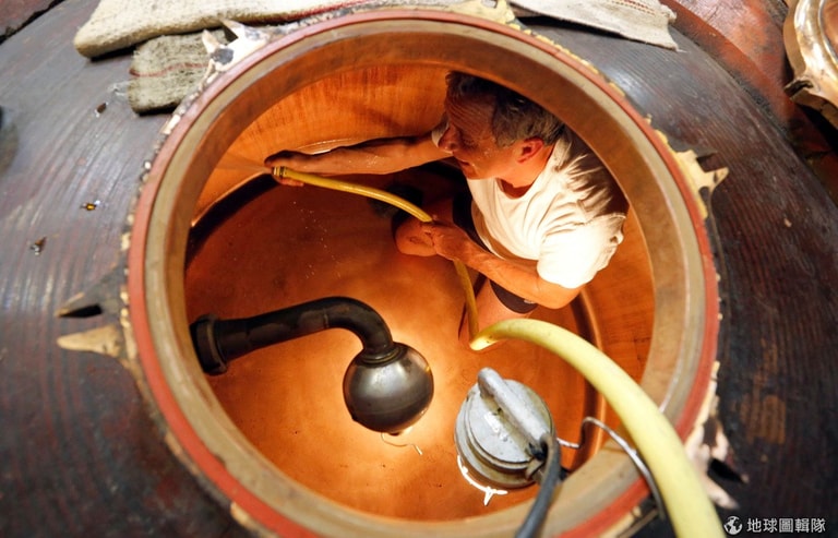 在夏朗特河畔新堡(Chateauneuf-sur-Charente),一名蒸餾場的工作人員正在清洗黃銅蒸餾器,為接下來的蒸餾製酒流程做準備。