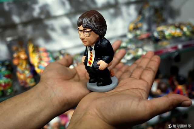 在巴塞隆納街頭,一名小販手上拿著被西班牙中央政府免職的前加泰隆尼亞自治區領導人普伊格蒙特(Carles Puigdemont)的公仔。