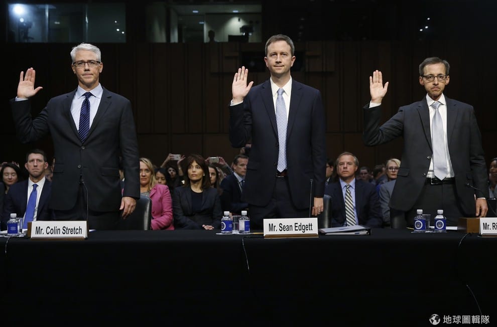 在美國參議院司法委員會的犯罪和恐怖主義小組委員會上,Facebook總法律顧問史翠奇(Colin Stretch,左)、Twitter代理總法律顧問埃奇特(Sean Edgett,中)和Google的法律和資安總監薩爾加多(Richard Salgado,右)在作證前舉手發誓,這場聽證會是為了打擊和減少俄國政治宣傳與網路上的極端內容而辦。