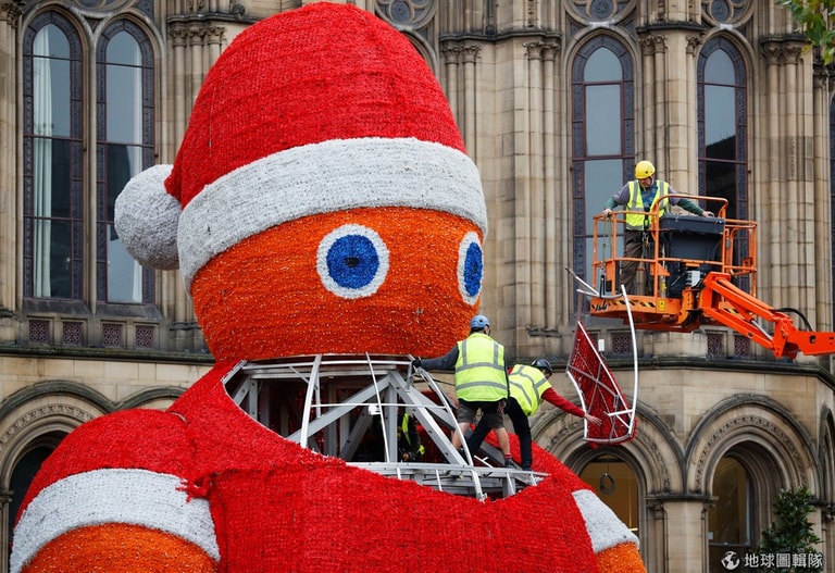 在萬聖節這一天,曼徹斯特的工人已經開始打造一尊巨大的聖誕老人公仔,準備迎接聖誕節的到來。