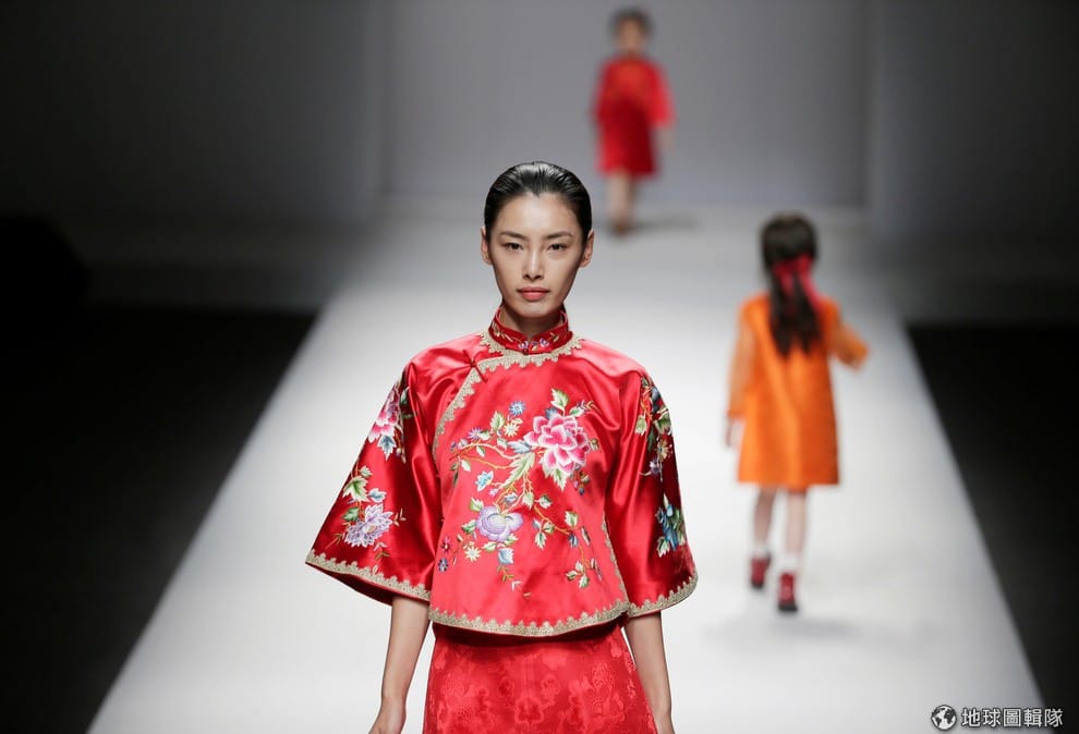 在北京時裝周上,模特兒正在展示上海設計師製作的改良式旗袍。