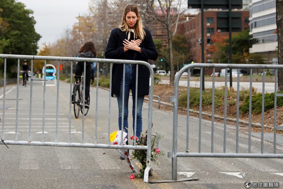 在紐約市,一名女子將鮮花擺在警方封鎖的案發現場外,悼念在卡車恐攻中喪生的受害者。