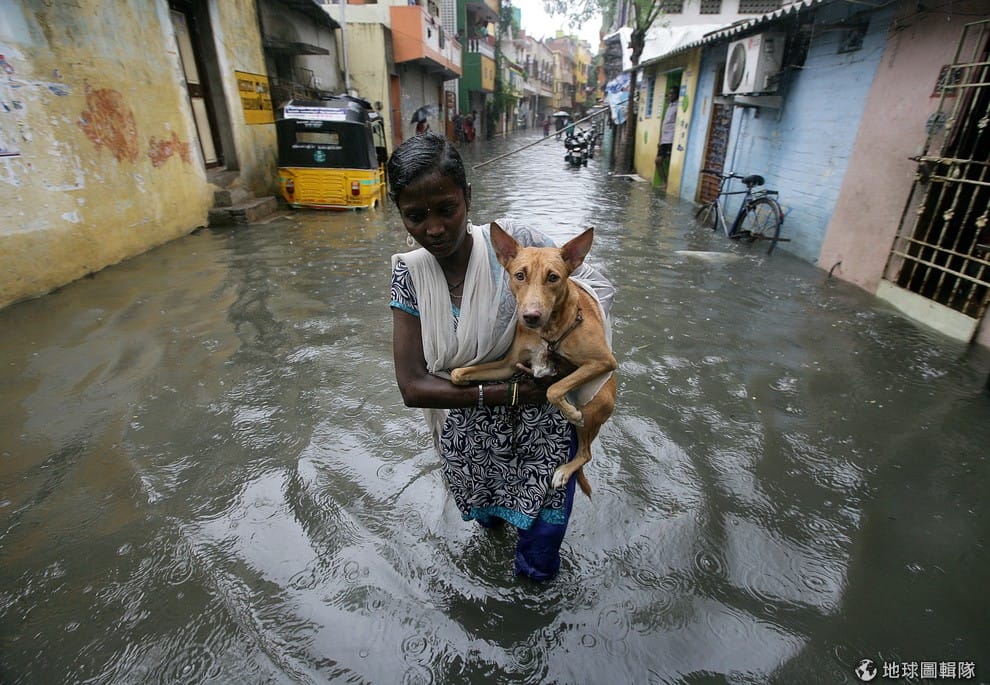 在印度東南部大城清奈(Chennai),一名女子抱著愛犬逃離被洪水破壞的家園。
