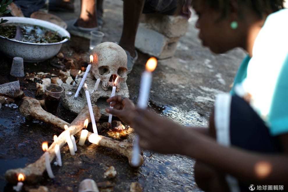 在首都太子港,一名信仰巫毒教的信徒點起一根根蠟燭祭祀看不見的神靈。