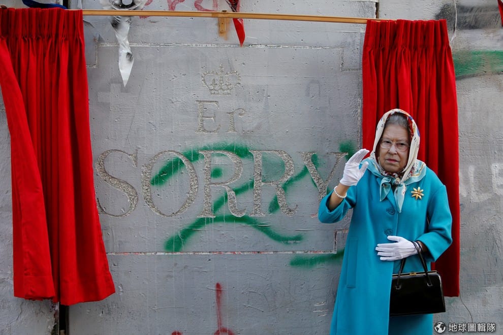 在英國塗鴉藝術家班克斯(Banksy)打造的「圍牆飯店」旁,一名打扮成英國女王伊麗莎白二世的演員在寫有「額呃...抱歉」字樣的作品旁留影。