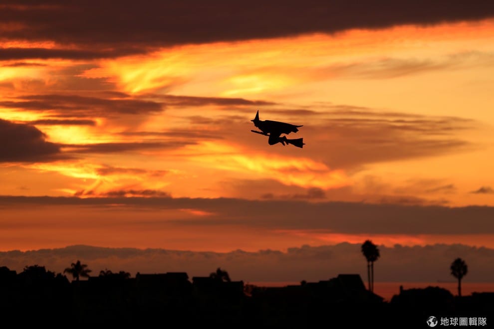 一台遠端遙控飛天女巫機器人在晚霞的映照下,徜徉在南加州的天際,帶給人一種迷幻瑰麗的感覺。