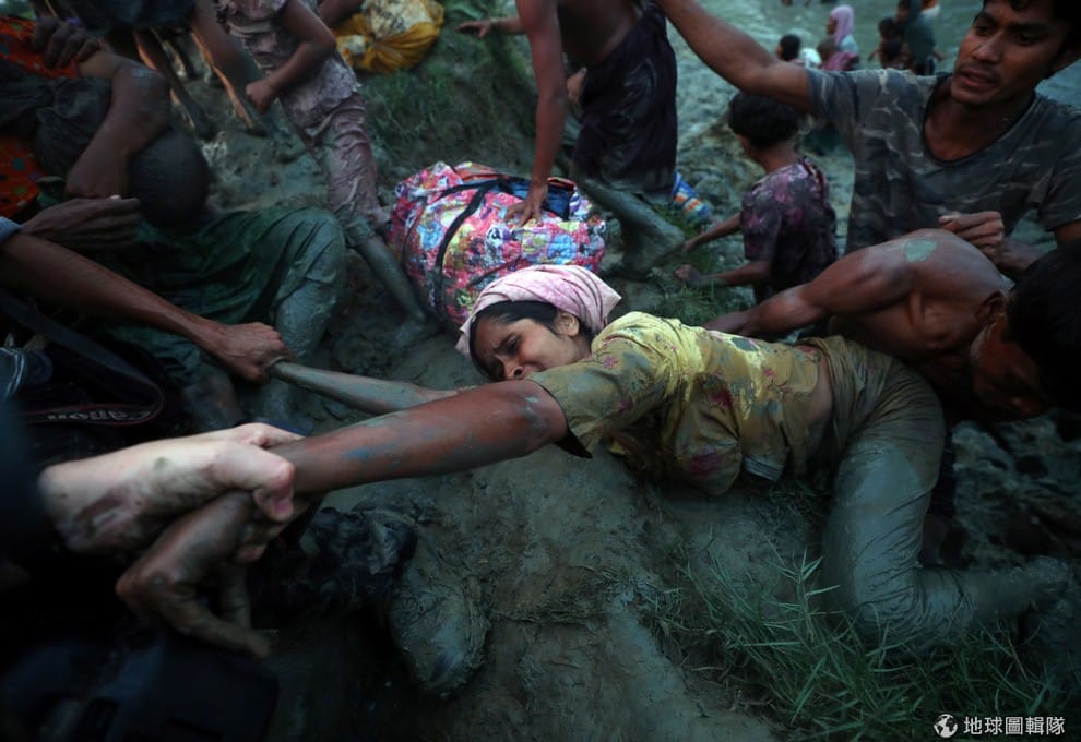 在鄰近科克斯巴扎爾縣(Cox's Bazar)的納夫河(Naf River),攝影師們對掙扎著爬上岸的洛興雅難民伸出援手。