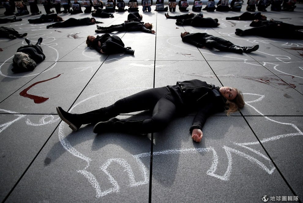 在巴黎龐畢度中心附近的人行道上,善待動物組織(PETA)的成員倒在畫有動物圖樣的地上,呼籲來來往往的路人不要再吃肉,藉此慶祝每年 11月1日的世界純素食日。