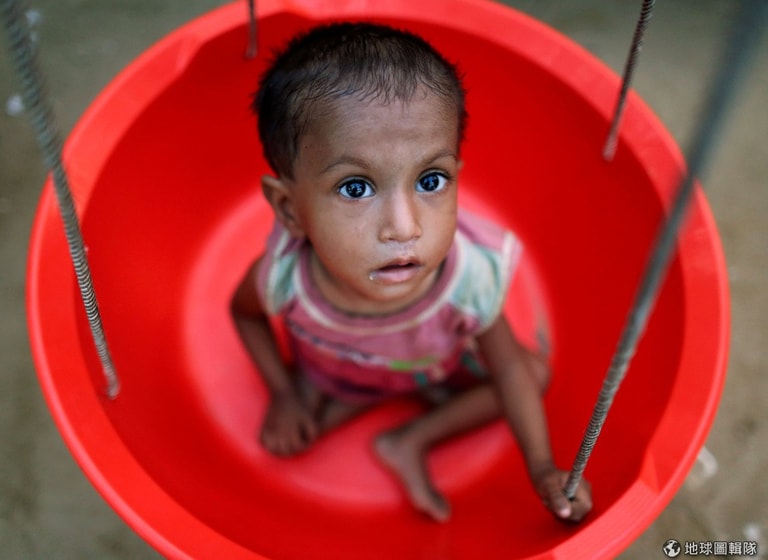 在鄰近科克斯巴扎爾縣(Cox's Bazar)的難民營,一名洛興雅難民小女孩坐在用來量體重的裝置上,待會工作人員會進一步檢查她有沒有營養不良的狀況。