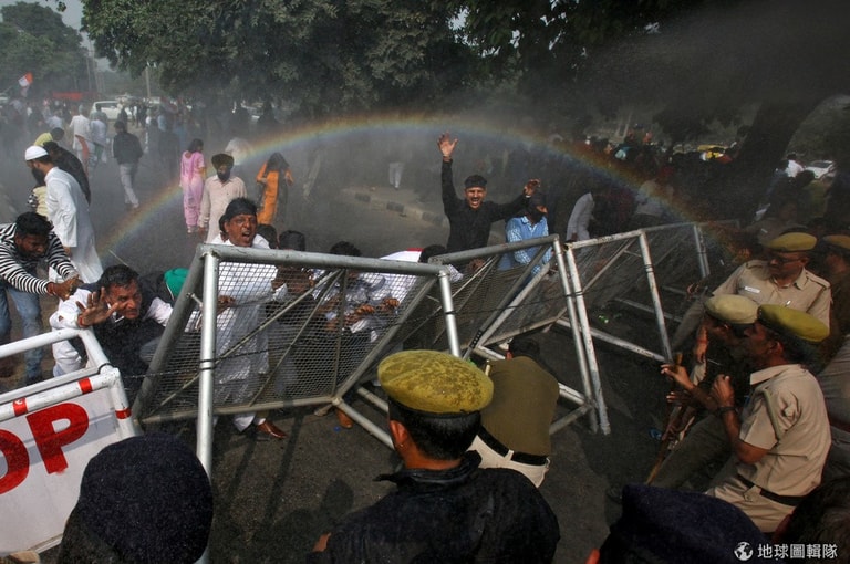 在北部的昌迪加爾(Chandigarh),警察忙著灑水驅離示威民眾,他們齊聚街頭抗議印度總理莫迪(Narendra Modi)已經實行一年的廢鈔政策,沒想到一道彩虹就這麼出現在抗議現場。