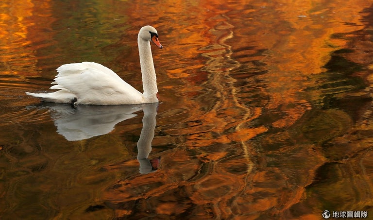 在蘇格蘭的法斯凱利湖(Loch Faskally),一隻天鵝緩緩游過映照出秋日景色的湖面。
