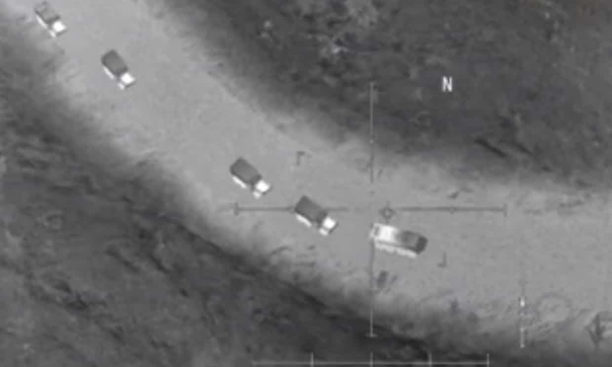 周二早上,俄國國防部在社群媒體上貼了這張圖片,指控美軍在敘利亞掩護伊斯蘭國車隊前往伊拉克邊境,然而這張圖片隨後被發現來自一款手機遊戲的截圖。