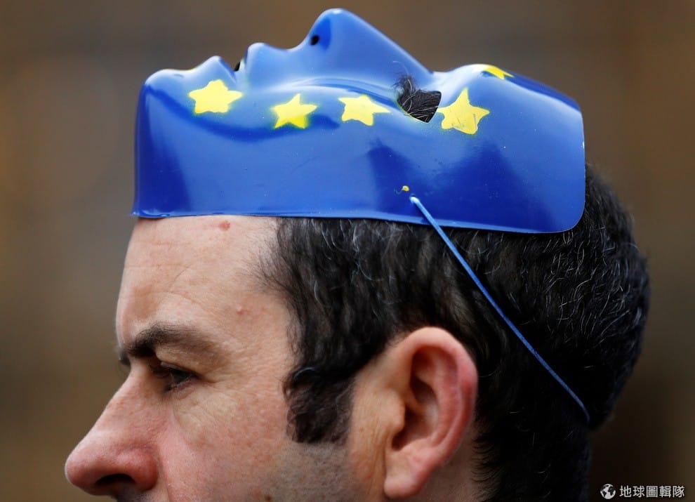 一名頭戴歐盟面具的示威者站在國會大廈前方,表達對英國脫歐的不滿。