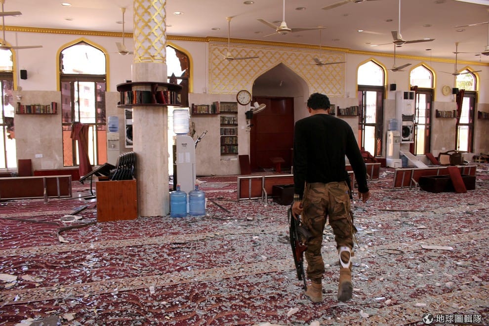 在葉門城市亞丁(Aden),一名來自阿拉伯聯軍的士兵正在調查受到汽車炸彈波及而受損的清真寺。