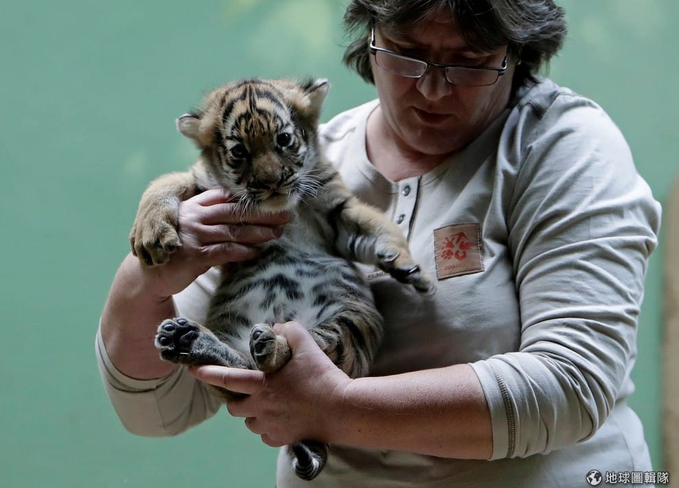 在布拉格動物園(Prague Zoo),動物管理員抱著一隻剛出生不久的馬來亞虎。