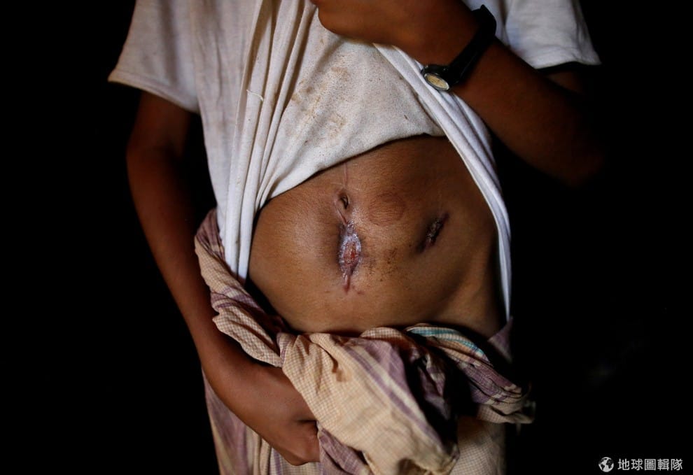 12歲的沙比克(Mohammad Shobaik)向攝影師展示了肚子上的傷口,他表示自己的村落遭到緬甸軍攻擊,自己也是在那時被射傷。