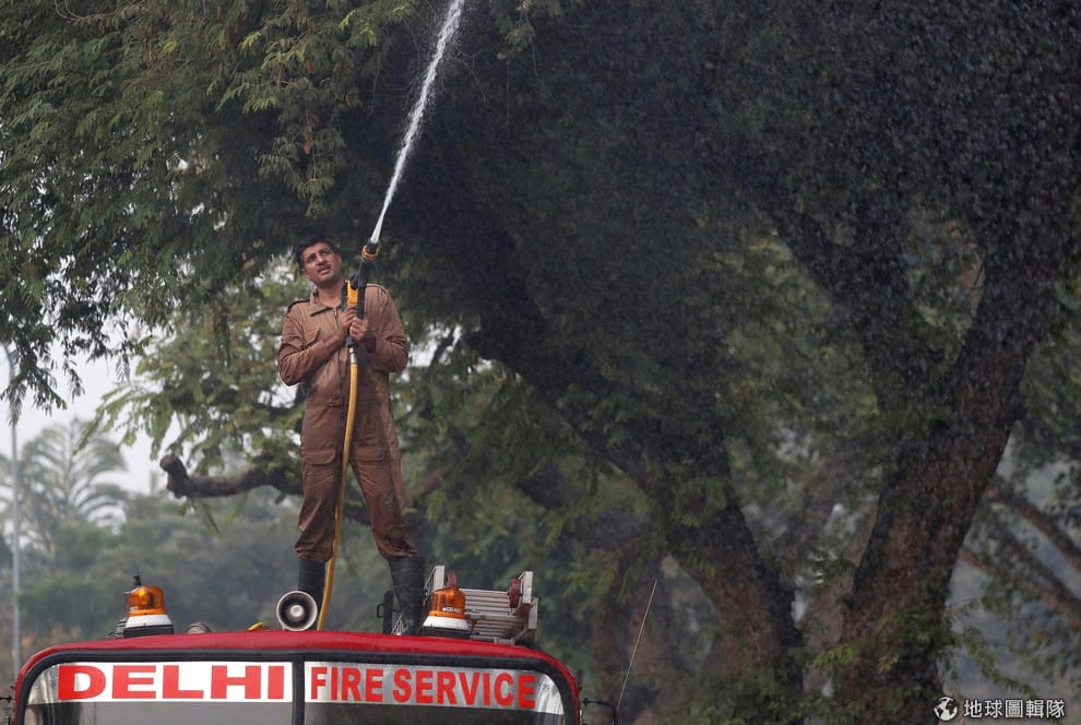 在德里的街頭,一名消防員以人工灑水的方式對抗嚴重的霾害問題。