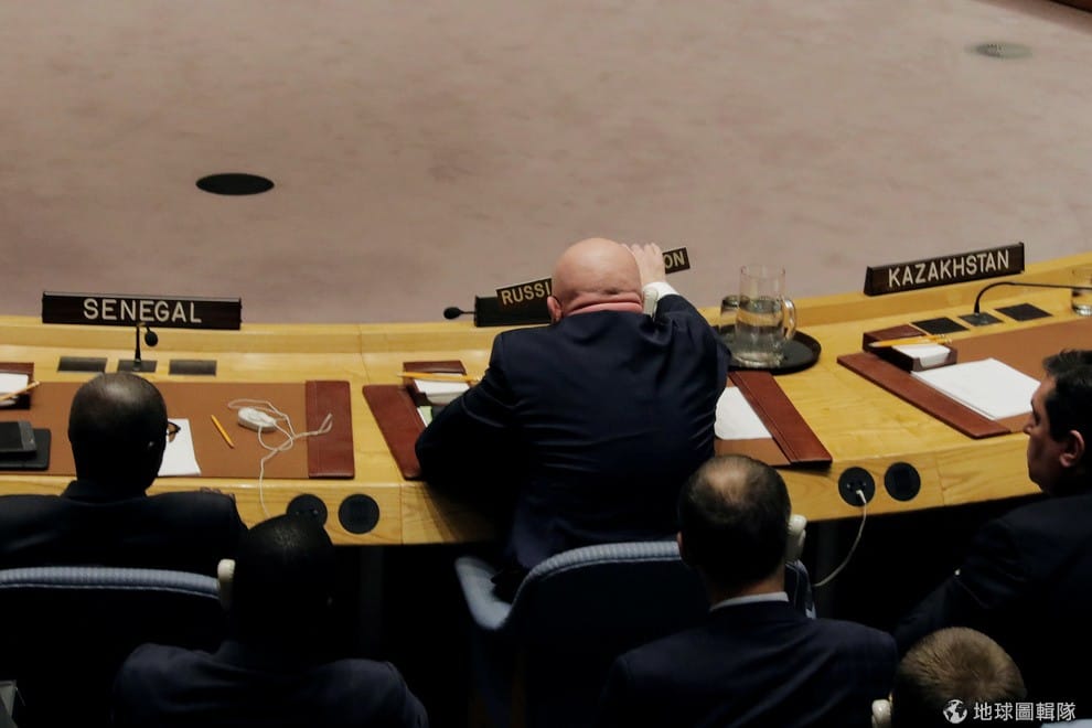 在聯合國安理會會議上,俄國大使納班濟亞(Vasily Nebenzya)傾身把剛剛拿起來揮舞的名牌擺好。他們正在就要不要重新調查敘利亞使用化武一事進行投票。