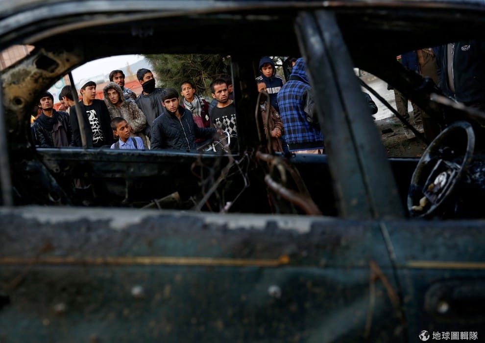 阿富汗首都喀布爾(Kabul)在 16號發生汽車炸彈爆炸事件,在事發後,被當作炸彈的汽車殘骸引起人們圍觀。
