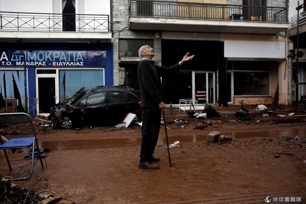 一名居民站在充滿泥濘的街道上,雅典西部城市因為豪雨導致嚴重水災,目前已經造成 15人死亡。