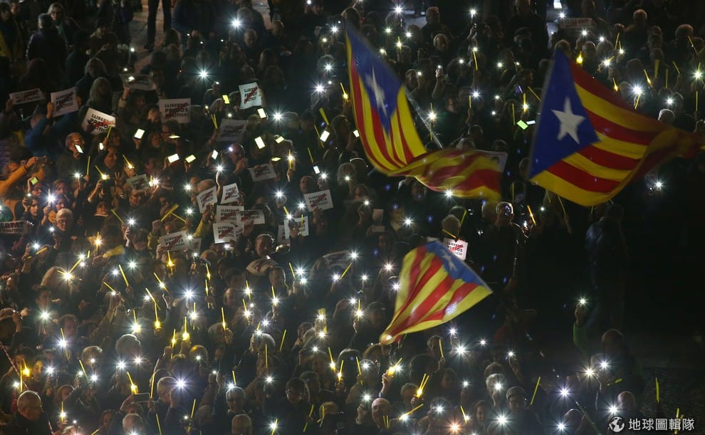 人們高舉著螢光棒和手機,聚集在巴塞隆納的聖若梅廣場(Sant Jaume square) ,希望西班牙政府可以釋放因為支持加泰隆尼亞獨立而被關押的示威人士與政治分子。