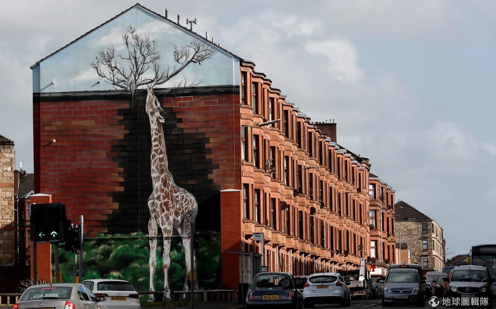 在蘇格蘭城市格拉斯哥(Glasgow),一棟建築末端被畫上長頸鹿吃葉子的塗鴉,與相映的藍空構成獨特景致。