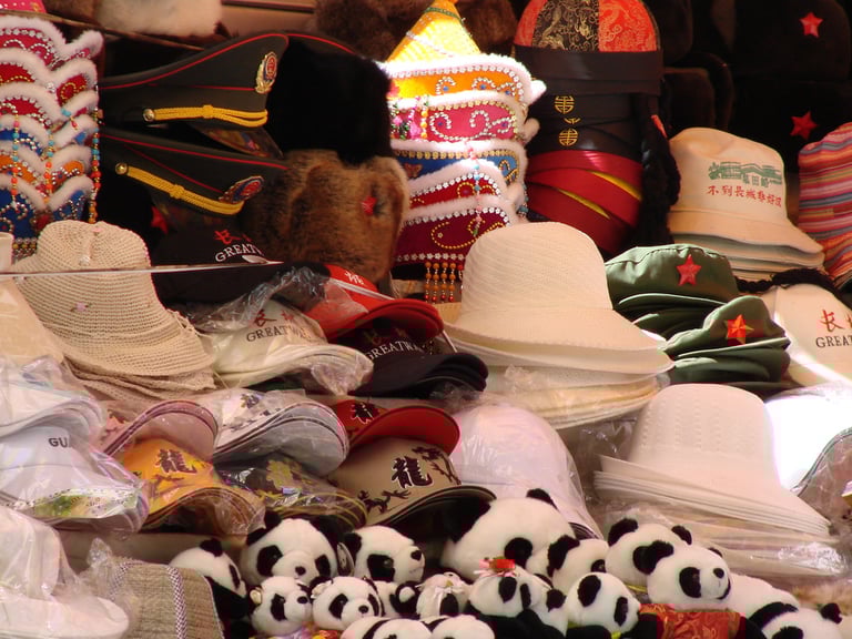 各式各樣帶有濃厚中國特色的帽子,擺在架上等著觀光客將它們帶回家。