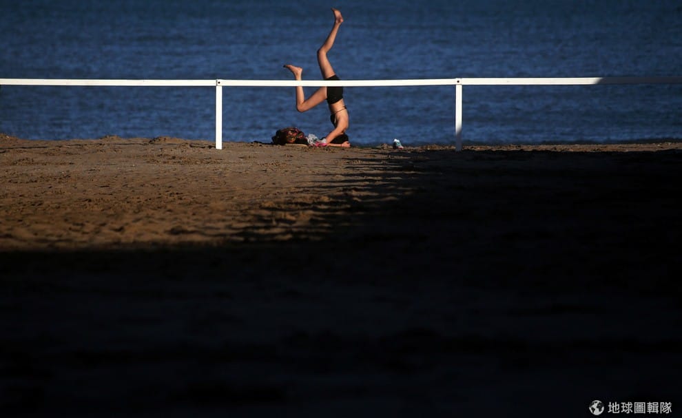 在臨海城市馬德普拉塔(Mar del Plata)的沙灘上,一名在熱身的女子被攝影師捕捉下來。