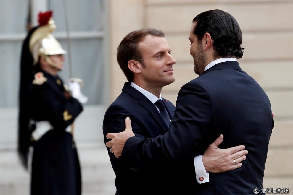 在法國總統府艾麗舍宮(Elysee Palace),法國總統馬克宏(Emmanuel Macron)接待閃辭的黎巴嫩前總理哈里里(Saad Hariri)來訪。