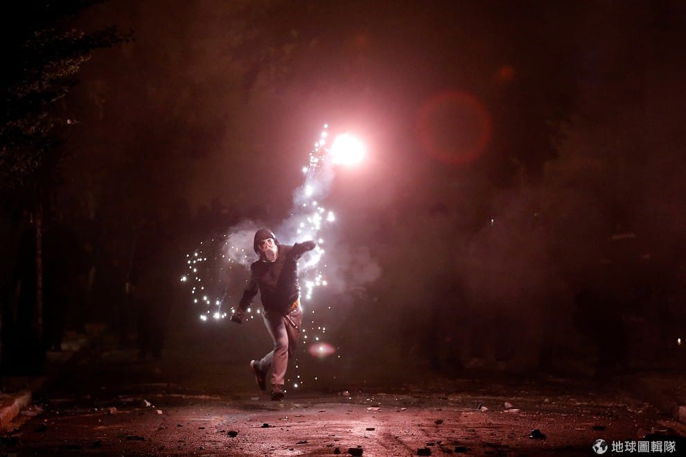 一名示威者向空中扔擲煙火,他們本來是為了紀念 1973年雅典理工大學抗議財政緊縮政策,卻在最後遭到血腥鎮壓的「1973年雅典理工大學起義」,這起紀念活動卻在不久後演變成與鎮暴警察的衝突。