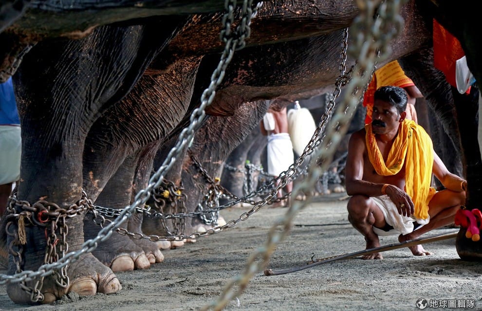 在印度城市科契(Kochi)的寺廟前,一名象夫正在看管成群被鎖鍊綁住的大象,稍後這些大象就會被裝飾上五顏六色的飾品,與鼓樂隊一同參加年度慶典Vrischikolsavam。