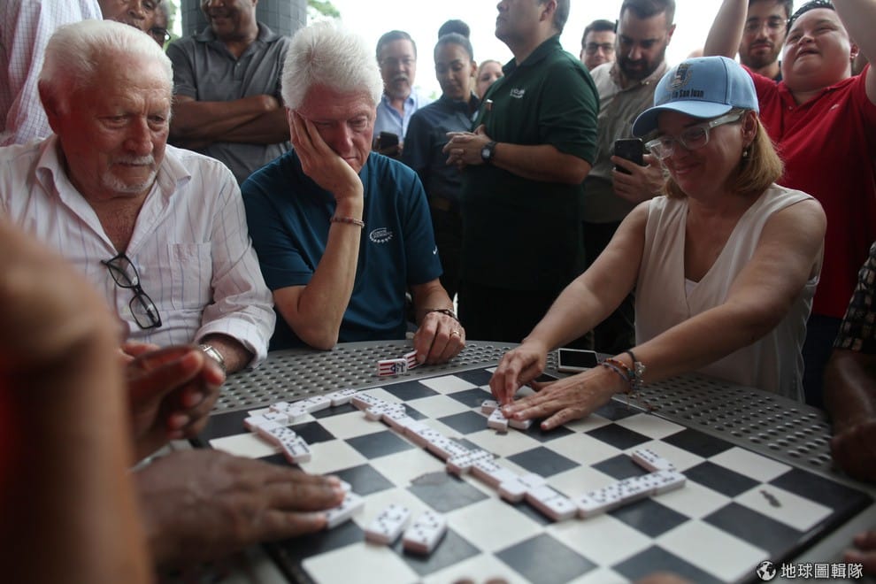美國前總統克林頓(Bill Clinton,畫面中間)和波多黎各首都聖胡安(San Juan)的市長克魯茲(Carmen Yulin Cruz,右)在市集內玩著多米諾骨牌。克林頓此行是為了慰問在今年 9月受到颶風嚴重侵擾的波多黎各人。