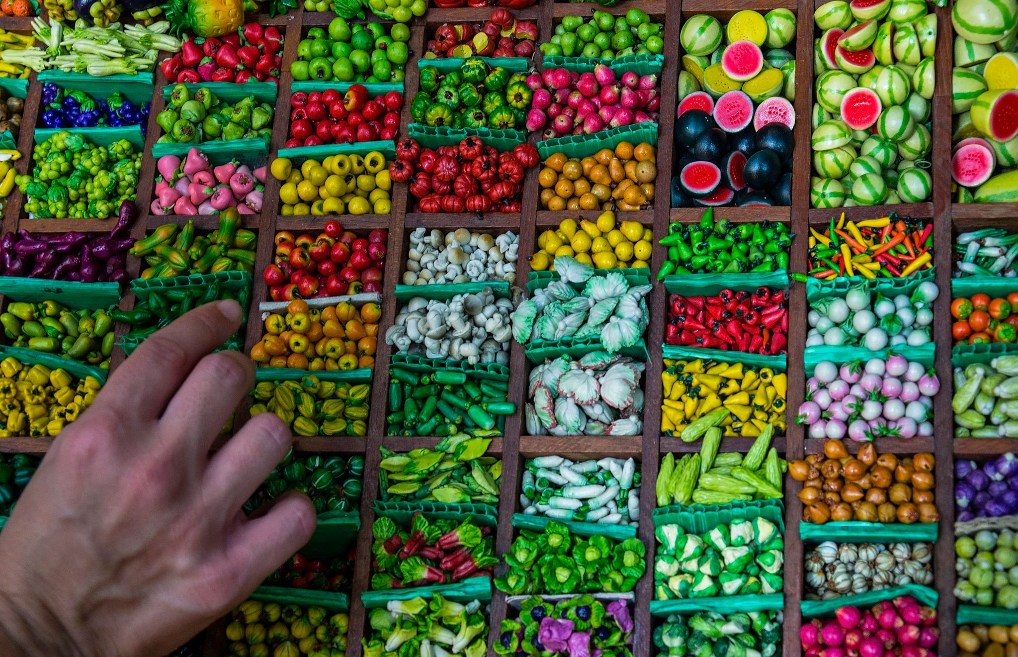 在曼谷玲瑯滿目的恰圖恰市集,小販正在整理五顏六色的蔬果小模型,這裡是觀光客造訪曼谷不能錯過的景點之一。