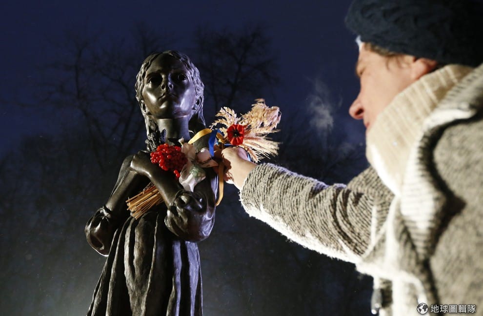 在烏克蘭首都基輔(Kiev),一名女子將花束安放在小女孩的雕像上,紀念 1932-1933年發生在前蘇聯時期的烏克蘭的大飢荒,當時有上百萬人因此餓死。