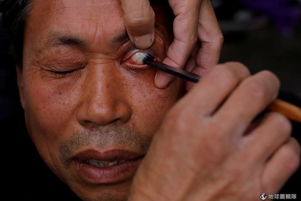 在成都市,62歲的街頭理髮師熊高武(音譯,Xiong Gaowu)正在用直式剃刀清理顧客的眼睛。