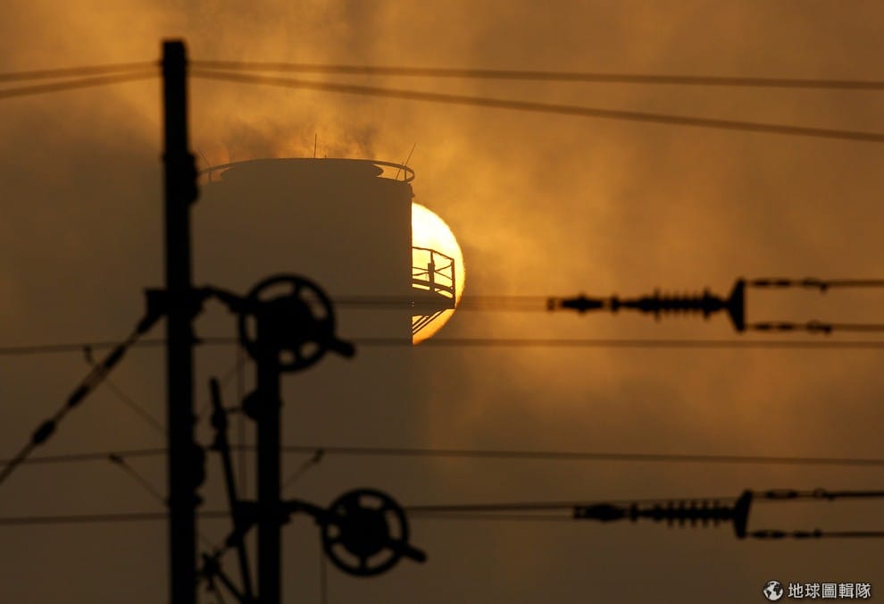在馬其頓首都史高比耶(Skopje),日出從電廠的煙囪旁冉冉上昇。