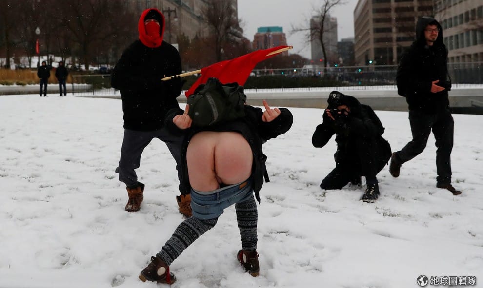 本月 25號,數個極右派組織聚集在魁北克的街頭進行反移民示威,一名男子褪去褲子、雙手朝示威團體比中指表達不滿。