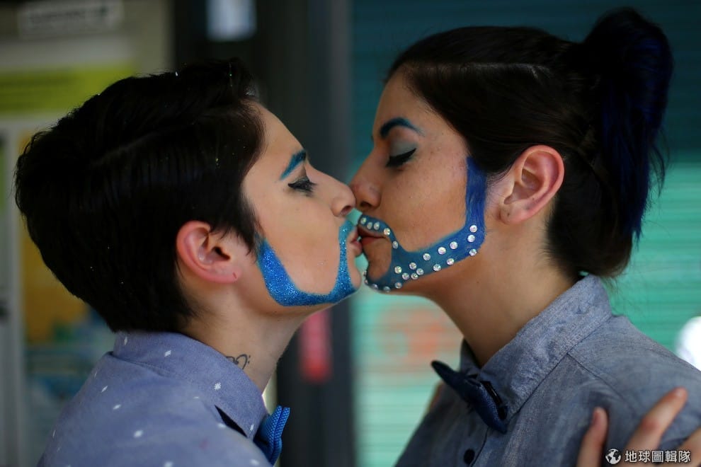 智利首都聖地亞哥(Santiago)在 25號進行LGBT遊行,一對臉上畫有彩繪的情侶在遊行隊伍中互相接吻。