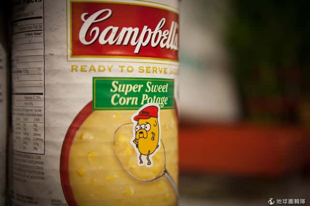 趁特價囤起好幾罐的玉米濃湯,連續喝上一個月真是受不了,黏上個卡通標籤砥礪自己一下,「下個月發薪水來換海鮮口味吧」。