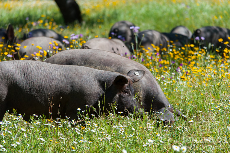 說到伊比利亞火腿耗時的製作過程,得先談到怎麼養伊比利亞豬。伊比利亞火腿必須來自伊比利亞黑蹄豬,或是基因純度 50%以上的混血伊比利亞豬。這些豬會被放養在種滿橡樹的牧場(dehesa),靠橡果和野草為食。在被屠宰前幾個月,牠們只能吃這些東西。