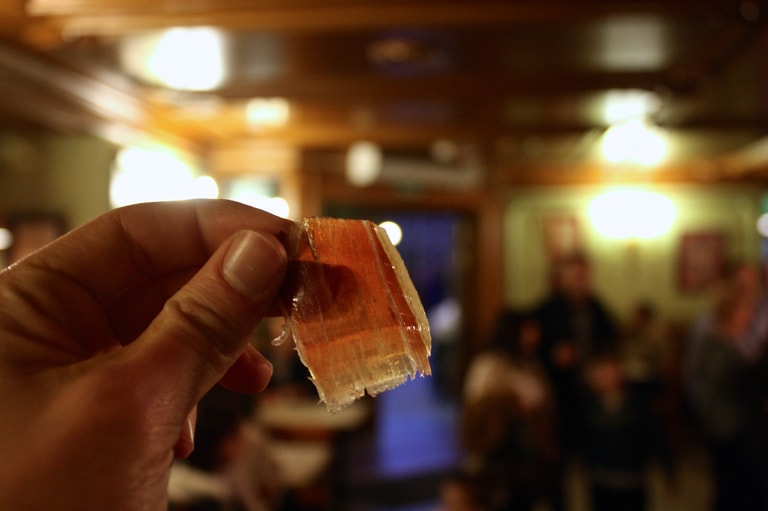 取下風乾好的伊比利亞火腿後,怎麼切成一片一片也大有學問。人們會把伊比利亞火腿整隻放在特製的火腿架(jamonero)上固定,然後用一把長刀小心翼翼地將伊比利亞火腿切片。