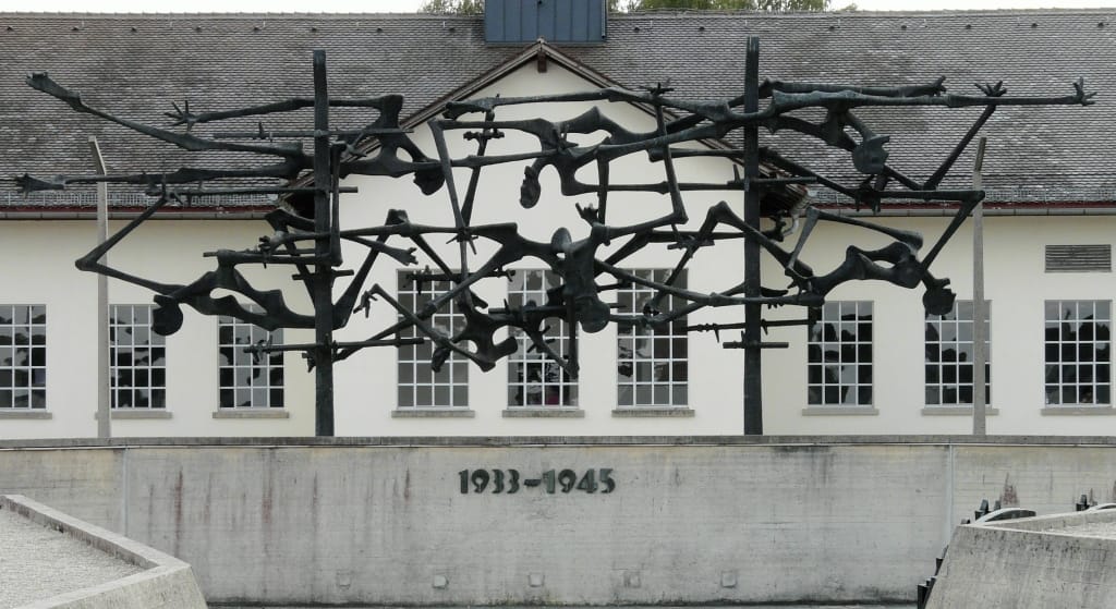 圖為位於德國南部的達豪(Dachau)集中營的紀念碑,該紀念碑以鐵絲網纏住的人體,象徵了當年在裡頭飽受折磨的人們。
