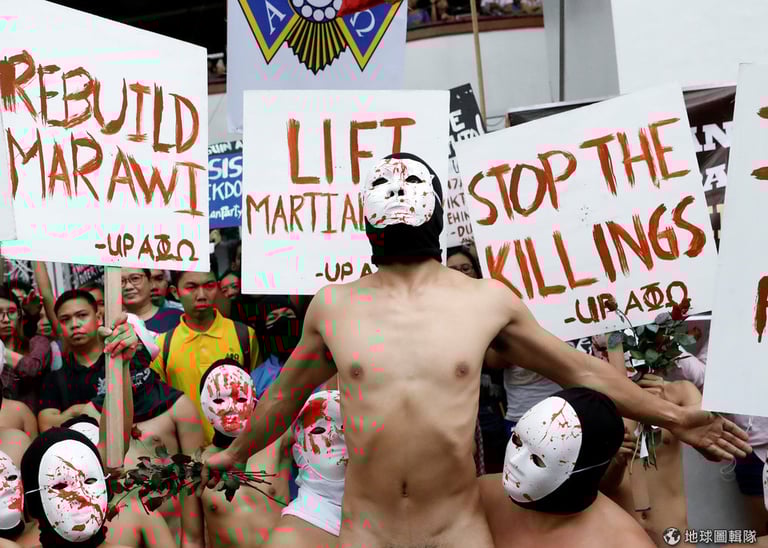 菲律賓大學Alpha Phi Omega(APO)兄弟會的成員裸著身子,頭戴面具抗議菲律賓當局實施法外制裁與戒嚴的政策。