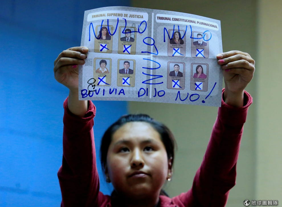一張亮出來的選票大大寫著「沒有法律效力,玻利維亞說:不要」。玻利維亞在 3號進行了法官選舉,被選出的 26名法官將會在 2018年1月上任,不過當局指出,有過半數的選票都被毀壞、或是屬於無效票。