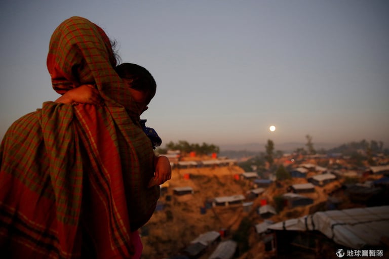 在孟加拉緊鄰緬甸的科克斯巴扎爾縣(Cox's Bazar)附近的難民營,一名洛興雅(Rohingya)難民抱著小孩,凝望遠處的滿月。