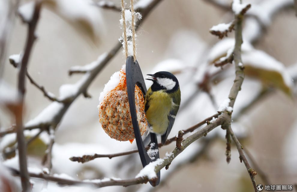 一隻山雀正在小口小口地享用掛在蘋果樹上的食物,可愛的一幕也被攝影師捕捉下來。