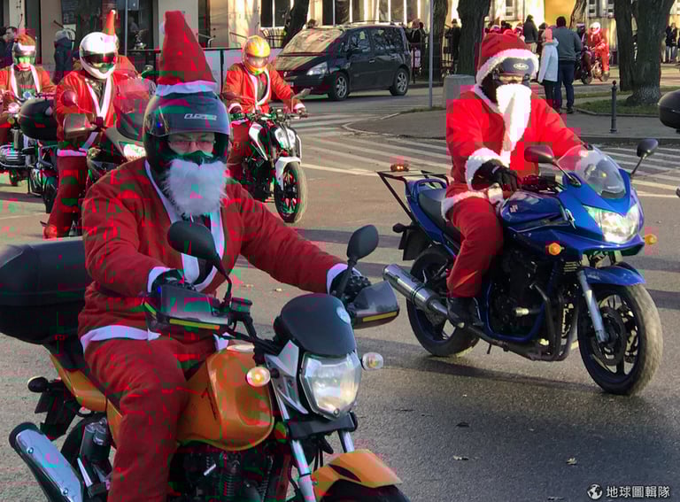 在波蘭的港口城市格地尼亞(Gdynia),一群機車騎士打扮成聖誕老人的模樣一同上街遊行。