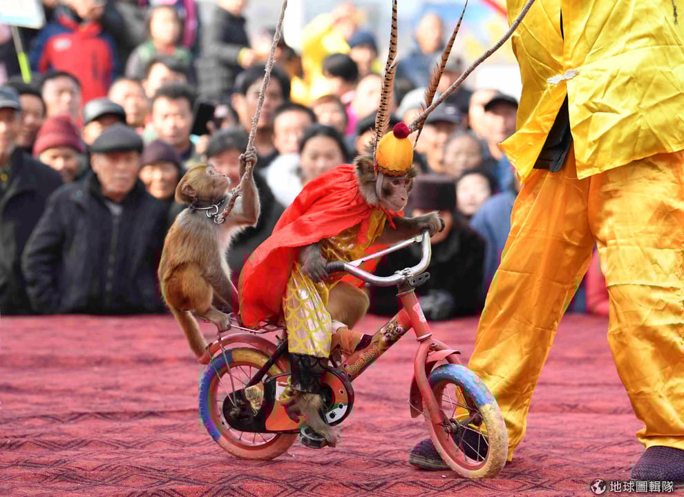 在安徽省,一隻被打扮成孫悟空的雜耍猴子熟稔地騎著腳踏車,也因此吸引了大批觀眾駐足觀賞。