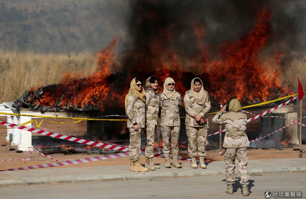 在巴基斯坦首都伊斯蘭瑪巴德(Islamabad),反毒警察的成員開心和後方被銷毀的毒品合影。